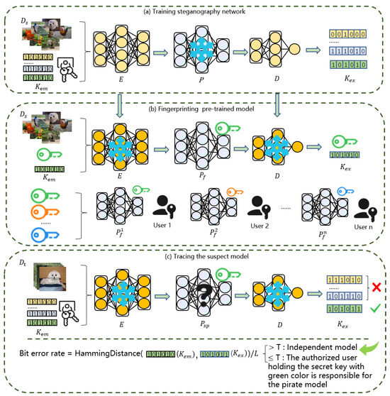 In this section, the pipeline of the proposed TraceGuard is illustrated in Figure 2. All notations used are defined in Table 2. Firstly, Figure 2a shows the learning of the stenography network, composed of an encoder and decoder pair, by using Df (). The encoder leans to embed the secret keys into cover images, and the decoder learns how to extract the secret keys from the embedding provided by a base pre-trained model. During the learning of the stenography network, the base pre-trained model is frozen. Secondly, Figure 2b shows how to fingerprint each base pre-trained model using Ds and secret keys. Before fingerprinting, each authorized user is designated a unique secret key. Then, the steganography network in the previous step is frozen, and the base pre-trained model is fine-tuned by using stego images such that one secret key among all the secret keys can be extracted with a lowest error rate. Such fine-tuning is accomplished for each secret key so that the base pre-trained model is fingerprinted for each authorized user and can be traced to the corresponding user. Finally, Figure 2c shows how to trace the suspect model by querying stego images. The owner of the pre-trained model embeds the secret key designated to each authorized user into Dt and feeds the stego images into the suspect pre-trained model. By comparing the error rate between the secret key extracted from the embedding provided by the suspect model and the embedded secret key, the owner can trace the responsibility of the authorized user holding the secret key with the minimum error rate, provided that the error rate is lower than the pre-set threshold T. Otherwise, the suspect model is determined to be an independent model.
