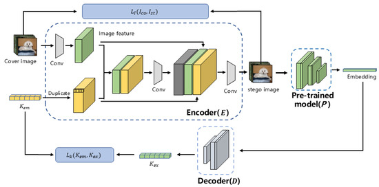 As shown in Figure 3, encoder E, decoder D, and pre-trained model P participate in the training of the steganography network. denotes the image set for training the steganography network, where , and denote the channel number, height, and width of the image, respectively. is the binary secret key of length L. The encoder E learns to embed into and obtain the stego image . Next, is fed into the pre-trained model to obtain the embedding. Finally, the decoder D learns to extract the secret key from the embedding. The structure of D is composed of two fully connected layers and an activation function ReLU, which can compress the embedding and transform it into with the same length as , in which each element is normalized between 0 and 1 using the sigmoid function.