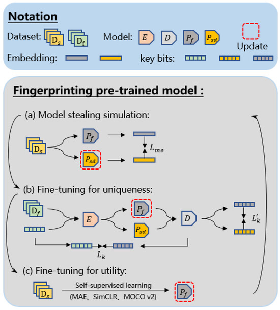 After learning the steganography network, the pre-trained model is fingerprinted, as shown in Figure 4. The pre-trained model is fine-tuned to implement the fingerprinting. Generally, the fingerprinting is designed to satisfy three requirements. First is the uniqueness of the fingerprint. This requirement is ensured by slightly altering the internal parameters of the pre-trained model to extract a unique key, excluding other keys from images embedded with secret keys. Second is the robustness against model stealing attack. The model stealing attack has seriously weakened the effectiveness of model tracing. Thus, such an attack is simulated by equipping a shadow model Psd during the fingerprinting. Third is the utility of the fingerprinted model. The requirement indicates that the performance of the fingerprinted model should be well maintained. To meet the requirements, two types of fine-tuning pre-trained model and model stealing simulation towards three objectives are alternately conducted. During the fingerprinting, Ds is used to accomplish the fingerprinting.