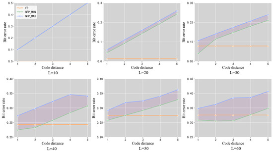 The impact of the length L and minimum code distance D on extraction error rate. The orange line represents the extraction error rate (FP) of , where corresponds to the i-th fingerprinted model. The blue line and the green line represent the maximum extraction error rate (NFP-MAX) and the minimum extraction error rate (NFP-MIN) for such that . The purple area represents the extraction error rate distribution for extracting .