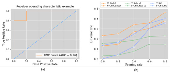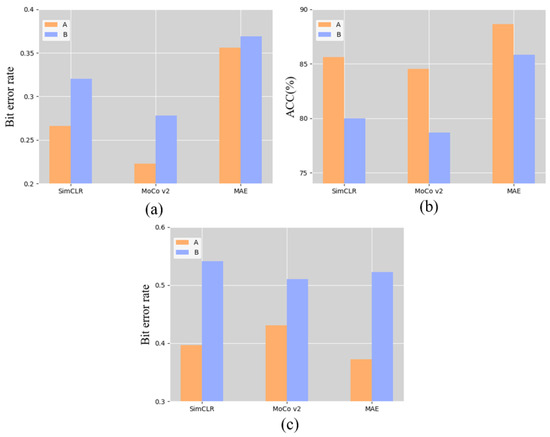 In this experiment, the influence of fine-tuning with self-supervised learning on performance is probed. Self-supervised fine-tuning is used to maintain the utility of the fingerprinted model. Keeping all other conditions unchanged, two fingerprinted models are obtained with and without self-supervised fine-tuning; the resultant models are named A and B, respectively. The performances evaluated by the bit error rate and ACC(%) of the two models are shown in Figure 9a and Figure 9b, respectively. First, the extraction error rate is used to compare model A and model B. As shown in Figure 9a, the FP of A is consistently lower than that of B, indicating that self-supervised fine-tuning can also increase the uniqueness. Second, accuracy on the downstream task is used to compare model A and model B. The two fingerprinted models are evaluated on downstream classification tasks separately, and the results are shown in Figure 9b. The accuracy of A is higher B, indicating that self-supervised fine-tuning can increase the utility.