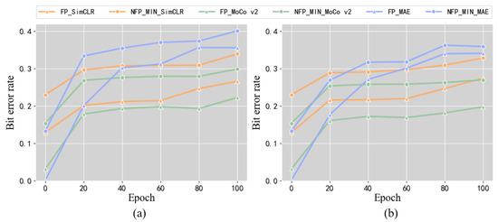Fine-tune all layers(FTAL) and re-train all layers (RTAL) are the two primary approaches for fine-tuning the pre-trained model. These refer to fine-tuning the pre-trained model with data that are the same as or distinct from the data used in the pre-trained model’s learning, respectively. The pre-trained models that learned with three self-supervised algorithms are tested, the epoch number of fine-tuning is set from among the options 0, 20, 40, 60, 80, 100, and FP and NFP-MIN are obtained, respectively. As shown in Figure 7, as the epoch of fine-tuning increases, the error rate of key extraction also increases. In addition, after more than 20 epochs, the key extraction error rate has shown a smooth fluctuation. Importantly, FP is consistently lower than NFP-MIN, demonstrating that TraceGuard can still trace the source of the suspect model under a fine-tuning attack.