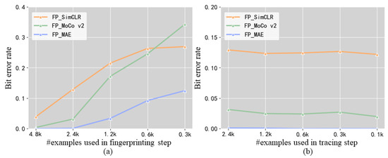 In this experiment, the number of examples used in the fingerprinting step are varied to probe its influence on the extraction error rate. The number of examples are varied from 4.8 k to 0.3 k and tested on three pre-trained models that have learned with the simclr, MoCo v2, and MAE algorithms, respectively. The trend in Figure 8a shows that the extraction error rate increases with fewer used examples. However, this does not imply that more examples are preferable, as more training time is also consumed. Consequently, fewer examples can be selected without compromising the extraction error rate. Eventually, 4.8 k example are used in the fingerprinting step.