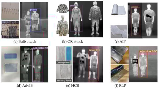 Infrared imaging offers significant advantages in certain specialized scenarios, making infrared object detection security essential. Adversarial attacks affect the output of the model by adding perturbations or adversarial patches to the image, which may cause security problems. Scholars are actively involved in investigating adversarial attacks against infrared systems. For example, Zhu et al. [1] utilized infrared imaging laws and light bulbs to construct a patch, presenting an attention-grabbing approach, as in Figure 1a. Subsequently, Zhu et al. [2] utilized insulation materials to hand-make a garment with patterns similar to QR codes in the infrared. However, due to the low resolution of the infrared image, it is difficult to present its details, as in Figure 1b. Both bulb and QR attacks are easy to fabricate in a physical world. Wei et al. [3] also used insulation material to create irregular patches called Adversarial Infrared Patch (AIP). Still, the grayscale of this material is not prominent enough in infrared imaging, as in Figure 1c. Wei et al. [4] and Hu et al. [5] experimented with hot and cold blocks to create their patches, as in Figure 1d,e. However, their patches were dispersed across the object, making it difficult to align the individual blocks accurately. In addition, the effectiveness of the cold and hot patches was limited by their practicality. Furthermore, Kim et al. [6,7] delved into adversarial attack strategies targeting both infrared and visible light. They proposed patches exploiting the fact that materials with varying infrared emissivities are depicted with differing grayscale intensities.