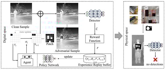 In this section, we present the operational mechanism as well as the specific process of generating infrared adversarial patches using reinforcement learning. We first define the form of infrared adversarial patches, explore the object detection-sensitive locations posing blocks, and post completed patches to clean samples to deceive the object detectors. The overall framework is shown in Figure 2.