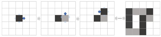 The decision process consists of a set of discrete actions , which is defined here as an agent that moves up, down, left, right, and simultaneously with grayscale assignments. Therefore, the number of executable actions n also depends on the type of material with different emissivity. The agent selects the grayscale value along with the position; for example, if there are two grayscales to choose from, that would result in eight actions, as shown in Figure 4. After each action , the agent moves from state to the next state . In our problem, the state is related to the time step t, we set the maximum time step to avoid a particular round taking too long. The state consists of the current position of the block as well as the block’s grayscale ; here the tuple is used to represent the state. We will embody the grayscale block on the image based on the position and grayscale information in the state.