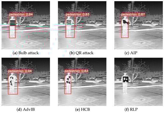 Competing methods: We conducted a comparative study for digital adversarial attacks to evaluate the efficacy of RLP in the field of infrared attacks relative to baseline approaches. Specifically, we evaluated the effectiveness of RLP compared with bulb attacks, QR attacks, AIP, HCB, and AdvIB for adversarial attacks. The patch size is adjusted dynamically based on the proportion of the target bounding box. For instance, if the current person’s pixel height is 200 and the patch length is set to a ratio of 0.24, then the patch length is . Since patches of various types are irregular, the patch area size is based on the size of the rectangular box that can enclose the patch. Table 1 provides details on our patch sizes. While the patch size certainly affects object detection, this paper focuses more on the impact caused by the specific shapes of patches.