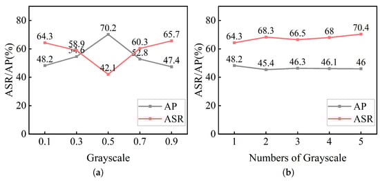 In the experiment with single-type grayscale blocks, Figure 7a shows the results. It can be observed that the effectiveness of the patch attack first decreases and then increases with the increase of grayscale values. This is because the patch blends with the human body when some grayscale pixels are close to the infrared imaging pixels of the human body itself, resulting in minimal disturbance and thus less noticeable effects. However, when the grayscale values are close to 0 and 1, the attack has a better effect.