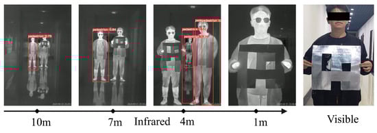 In the physical world, we were able to capture infrared images using an IRay T3 Pro cell phone thermal camera with an imaging resolution of . During the recording process, the camera was connected to the cell phone for a real-time image display. The subject only needs to pick up or stick this 40 cm × 40 cm patch to the body. Our physical experimental setup allowed for shooting distances from 1 to 10 m, recording videos in different scenes. Referring to previous practice [4], we recorded three videos in different scenes, then extracted one frame every 2 s to capture 112 images and annotated them with 224 labels, where 64 images containing 128 labels were captured in the indoor scene and 48 images containing 96 labels were captured in the outdoor scene. Then we put the labeled images in the detector to verify the results and calculated the ASR.