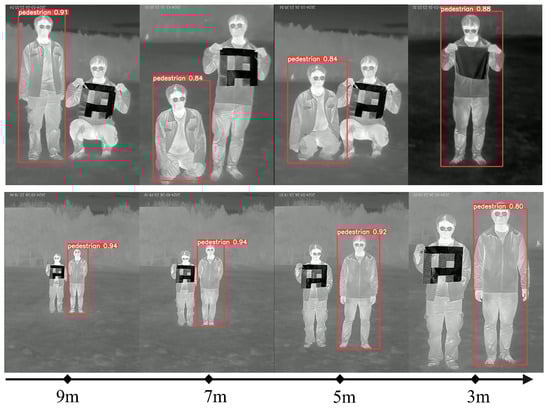 The performance of our method outdoors at night, where the infrared imaging of the patches has lower gray values due to colder outdoor temperatures and weak illumination. The results include detection results for different postures and different distances.