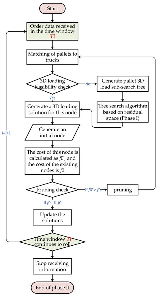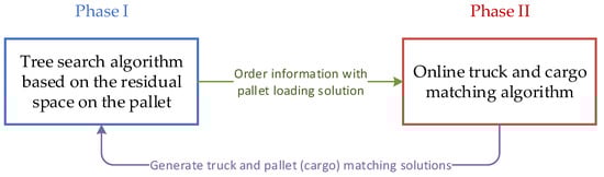 - To solve this problem, a two-stage hybrid heuristic algorithm is proposed. Stage 1: A tree search algorithm based on residual space is designed to solve the optimal 3D pallet loading problem. This algorithm determines the best layout for loading cargo into pallets while maximizing the usage of available space and ensuring proper stacking. Stage 2: A heuristic online truck–cargo matching algorithm is introduced to solve the vehicle assignment problem. This stage integrates the results of the 3D pallet loading from Stage 1 and assigns the loaded pallets to heterogeneous trucks based on available capacities and transportation costs. A rolling time horizon is used to manage dynamic order arrivals and handle time windows effectively.