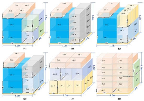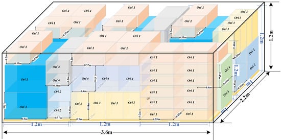 Then, it is necessary to determine where the goods are loaded on the pallet. There are six loading directions for goods on a standard pallet: When placing a rectangular cuboid with three dimensions in a three-dimensional Cartesian coordinate system, there are six possible orientations for loading it. These orientations depend on the alignment of the cuboid’s dimensions with the X-, Y-, and Z-axes of the coordinate system. Each unique orientation can be represented by a “direction number”, Ori. Let the length , width , and height of the cuboid correspond to different axes of the coordinate system. We define the six orientations (and their corresponding direction numbers) as follows: Ori 1: ‖ X, ‖ Y, ‖ Z; Ori 2: ‖ X, ‖ Y, ‖ Z; Ori 3: ‖ X, ‖ Y, ‖ Z; Ori 4: ‖ X, ‖ Y, ‖ Z; Ori 5: ‖ X, ‖ Y, ‖ Z; Ori 6: ‖ X, ‖ Y, ‖ Z. Figure 3 visually represents the cuboid in each of these six orientations within the Cartesian coordinate system.