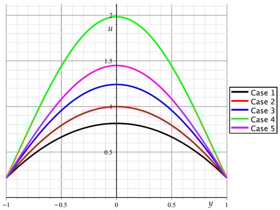 Velocity profiles for Cases 1–5 with , , , , , , , , , and .