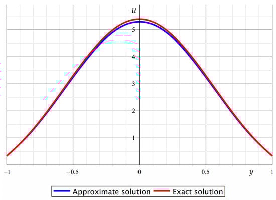 Using the above exact solutions, we have performed an extra verification of the algorithm of constructing weak solutions that was applied by us in Section 5.1 for proving Theorem 1(a). As expected, we have obtained a good agreement between the exact solutions and the suitable Galerkin approximate solutions. This is well illustrated by Figure 3. In the corresponding numerical experiment, the relative percentage error of calculation of the velocity field, constructed by Galerkin’s method with the six basis functions , , …, , is equal to 1.4% with respect to the -norm.