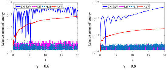 Figure 1 presents a comparison of the relative errors in energy conservation for four different numerical schemes under varying values of the parameter . The two graphs depict the relative error of these schemes for and , plotted over time. For , the CN-SAV method exhibits oscillations in energy error, with values fluctuating between and , whereas the AVF scheme shows a steady increase in error, starting at around and rising to . In contrast, the L13 and LI4 methods maintain significantly lower and stable errors around to , demonstrating excellent energy conservation properties. As increases to 0.6, the CN-SAV method experiences even larger oscillations, with errors reaching up to , while the AVF scheme again shows a gradual increase in error, this time reaching around . However, the LI3 and L14 methods continue to display superior performance, maintaining low relative errors similar to the case with . Overall, the comparison highlights that, regardless of the value of , the L13 and L14 schemes consistently provide the best results in terms of energy conservation, while the CN-SAV and AVF schemes exhibit larger errors, with the errors growing more pronounced as increases.