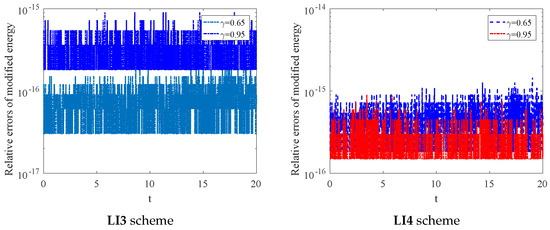 where . These methods attain fourth-order accuracy [21]. In the subsequent discussions, we denote Schemes (38) and (39), which satisfy the symplectic condition, as the LI3 and LI4 schemes for and , respectively.