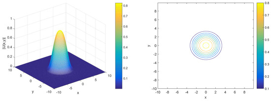 Figure 2 compares the relative errors in modified energy for the LI3 and LI4 schemes under two different values of the parameter , specifically and . The LI3 scheme (left plot) exhibits consistently low relative errors between and , with small fluctuations over time, slightly more noticeable for . In the LI4 scheme (right plot), the relative error also remains low, but with slightly larger fluctuations, especially for , where the error reaches up to . For , both schemes perform better, with smaller fluctuations and relative errors closer to . Overall, both schemes demonstrate strong energy conservation. Then, we investigate the relationship between the evolution of the soliton and the for nonlocal system Figure 3 displays the profile (left) and contour plot (right) of the numerical solutions for two different values of . The top row shows the results for , where the 3D profile indicates a smooth, symmetric peak centered around with values decreasing radially. The contour plot on the right confirms this radial symmetry, with evenly spaced concentric rings representing decreasing values as one moves outward from the center. The bottom row illustrates the same type of plots for . Figure 3 and Figure 4 depict the evolution of the solution, with the main difference being the height of the peak between and , suggesting a slight change in the intensity of the solution based on the value of .
