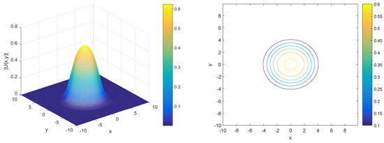 Profile (left) and contour plot (right) of numerical solution for .