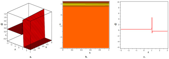 (a–c) The 3D, contour, and 2D (when ) graphs for the solitary kink soliton solution stated in (38) are plotted for .