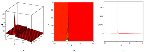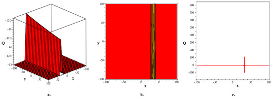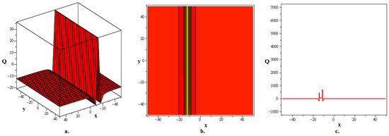 (a–c) The 3D, contour, and 2D (when ) graphs for the lump-type kink soliton solution stated in (42) are plotted for .