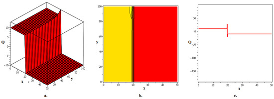 (a–c) The 3D, contour, and 2D (when ) graphs for the solitary kink soliton solution stated in (20) are plotted for .