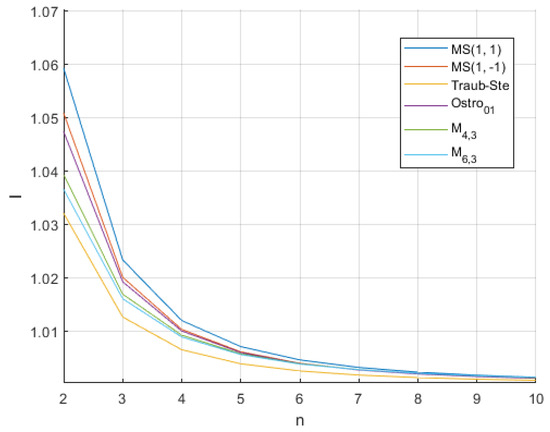 In order to show more clearly how computational cost influences the efficiency index , where p is the convergence order of the corresponding scheme (see [24]), we present Figure 1 and Figure 2 for different sizes of the nonlinear system to be solved.