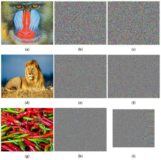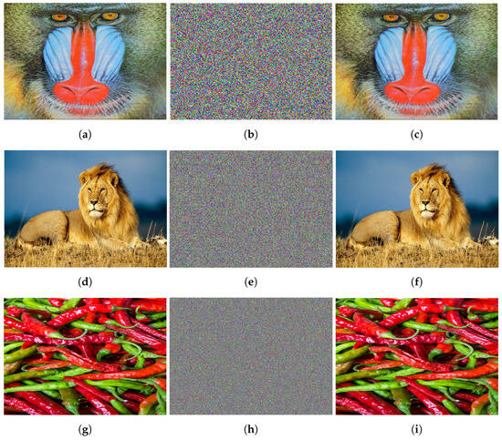 (a–c) corresponds to original, encrypted, and decrypted (using wrong key) image of “Mandrill”. (d–f) corresponds to original, encrypted, and decrypted (using wrong key) image of “Lion”. (g–i) corresponds to original, encrypted, and decrypted (using wrong key) image of “Peppers”.