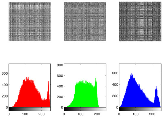 The effectiveness of the IEA is obtained by comparing the histograms of the original as well as encrypted images. To protect against statistical attacks, it is crucial that there is no statistical similarity among the plaintext image and the encrypted image. The histogram analysis for the original image, shuffled image, encrypted image, and decrypted image of Mandrill across the , and channels is presented in Figure 20, Figure 21 and Figure 22. As illustrated in Figure 22, the histograms of the components of the encrypted image exhibit a flat distribution. Thus, in terms of histogram analysis, this algorithm is sufficiently robust to resist statistical attacks.