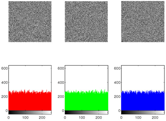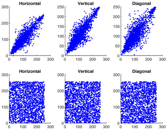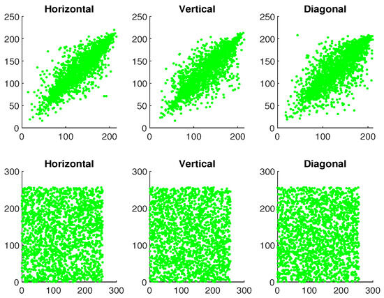 where and ; O represents the total number pixels; and ♭, ♮ are the color values of the two adjacent pixels in the images. Table 1 shows the correlation values for plaintext and ciphertext of the image ‘Mandrill’. In addition, Figure 23, Figure 24 and Figure 25 illustrate the pixel distribution of plaintext image and ciphertext image of Mandrill on three color channels in horizontal (H), vertical (V), and diagonal (D) directions. Figure 23, Figure 24 and Figure 25 and Table 1 demonstrate the effectiveness of our algorithm and the security of the IE.