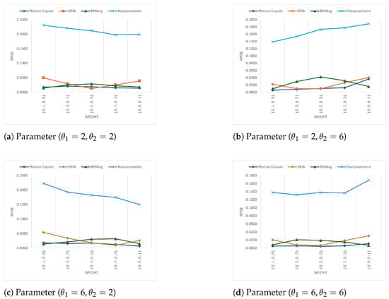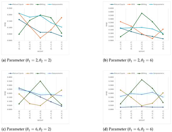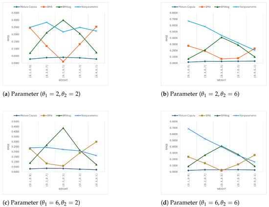 The findings suggest that while the BMAlog method has some potential in handling extreme weight distributions, its performance is generally not superior to the Mixture Copula method in most cases. The BMAlog method’s advantage appears limited to very specific situations where the weight is almost entirely skewed towards one component, as seen at . This could be due to the log-transformed weighting scheme in BMAlog, which might better adjust to scenarios with highly uneven contributions from the two copulas.