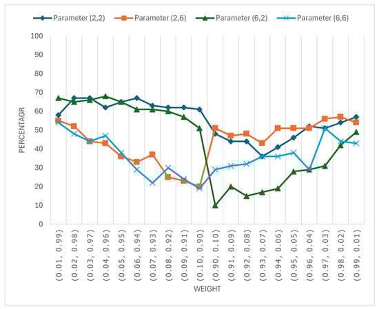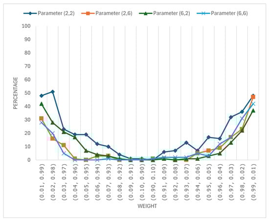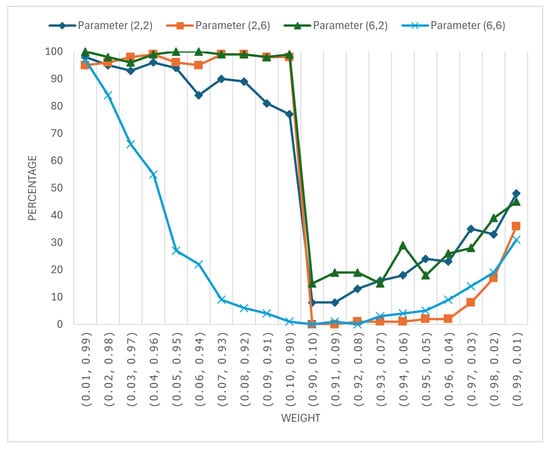 Figure 4 shows the percentage of cases where the BMAlog method performs better than the Mixture Copula method for different weight settings in the mixture of Clayton and Gumbel copulas. The results suggest that the Mixture Copula method generally outperforms the BMAlog method across most scenarios, even when the weight distribution is extreme. This is indicated by the relatively low percentages, especially when the weights are closer to balanced (e.g., ) or moderately skewed.