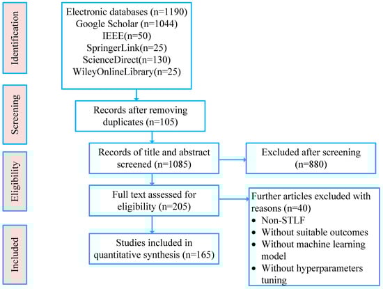 - Screening: The selected research papers found from key word searching are screened by giving emphasis on electric load forecasting or prediction using metaheuristic algorithms. The screening process was carried out through the title and abstract of 1085 articles. Around 880 articles were excluded as they did not meet the inclusion criteria.