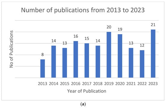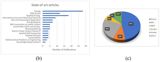 By following the above four steps, 165 research articles have been found that are based on short-term load forecasting using different metaheuristic algorithms (Figure 1). Figure 2a shows the number of publications from 2013 to 2023, and their publication sites are shown in Figure 2b. These publication sites are mostly part of Elsevier, IEEE, MDPI, Springer, Hindawi, etc. The percentage shares of these publishers are shown in Figure 2c.