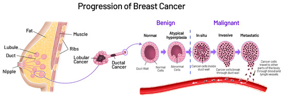 Projections indicate that this trend will continue, with a predicted 50% surge in cancer incidence by 2040 compared to 2020, underscoring the escalating global cancer burden. It has now been proven that breast cancer is a complicated illness with a variety of biological behaviors that are impacted by a number of environmental, hormonal, and genetic factors. Comprehending the causes and course of breast cancer is essential to developing therapeutic strategies and improving patient outcomes. Breast cancer is a cancer that starts in the cells of the breast and is significantly more common in women than in males. This kind of cancer starts when aberrant cells in the breast grow out of control, creating a tumor that can potentially migrate to other parts of the body and penetrate surrounding tissues, as shown in Figure 1 [1].
