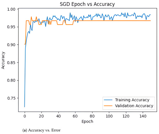 During the training phase, this weight update procedure in Equations (8) and (9) is applied iteratively across all training examples. Each training example contributes to the cumulative adjustment of the weights, enabling the network to learn from diverse instances and generalize effectively. The training process consists of multiple epochs, where each epoch represents a complete pass through the entire training dataset. Within each epoch, the weights are updated continuously for each training sample, resulting in a gradual refinement of the model parameters. This repeated application of the weight update rules promotes convergence towards an optimal set of weights that minimize the overall error function L. Ultimately, the goal of this iterative training process is to progressively minimize the error function, enhancing the network’s accuracy and predictive capabilities. As the network adjusts its weights based on the computed gradients, it becomes increasingly adept at making accurate predictions on unseen data, thereby improving its robustness and effectiveness in practical applications. This systematic approach not only allows the model to learn complex patterns within the data but also fosters the development of a neural network that generalizes well, reducing the likelihood of overfitting. By adhering to the principles of backpropagation and gradient descent, the network can efficiently navigate the high-dimensional parameter space, achieving convergence toward a locally optimal solution that enhances its performance.