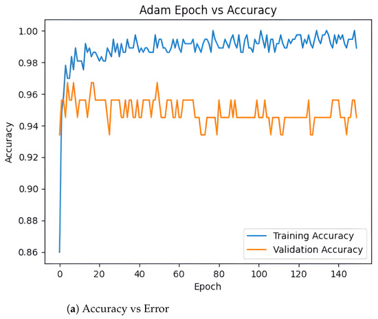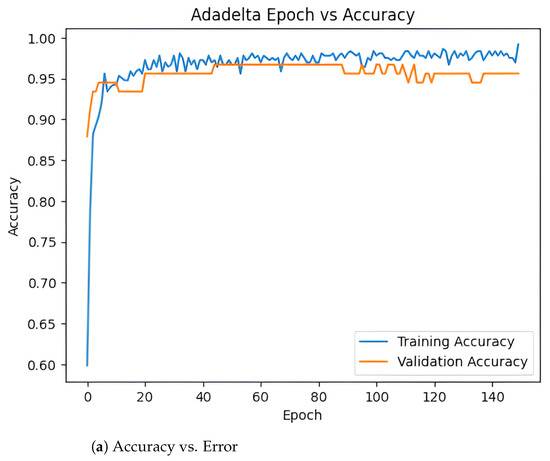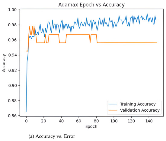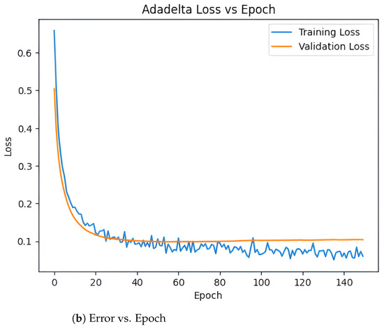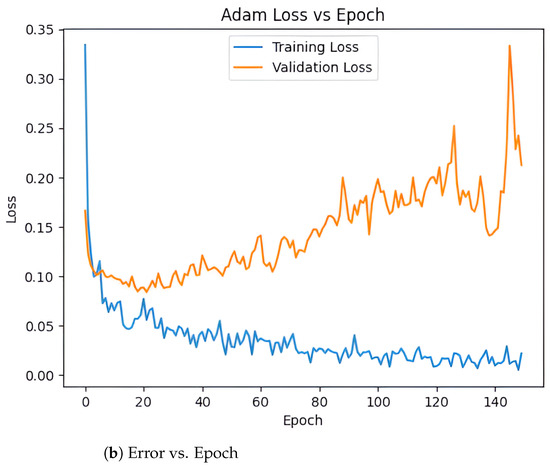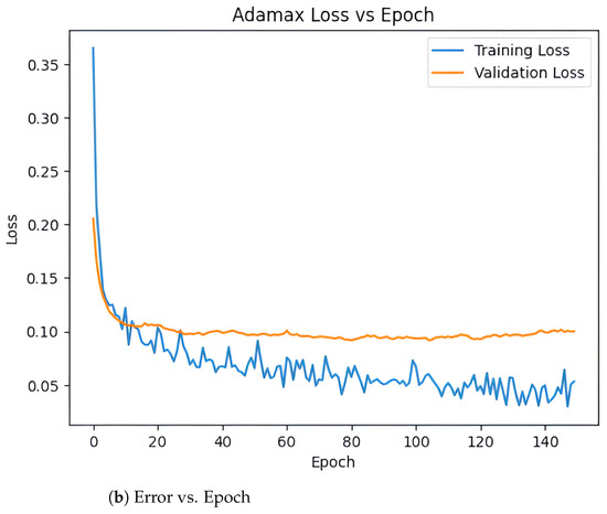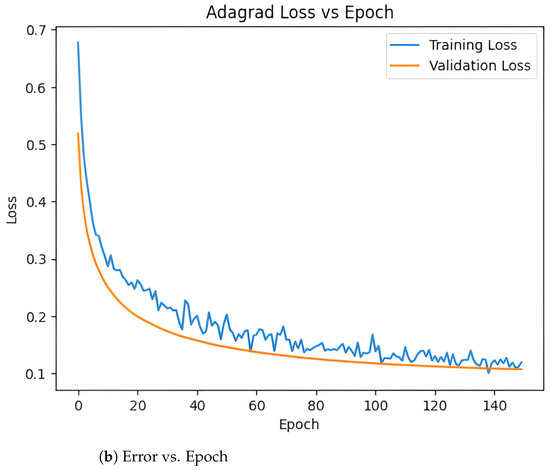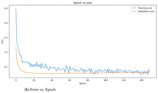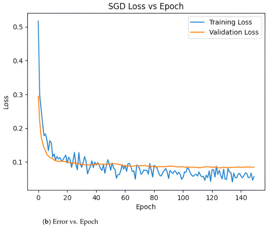 The primary goal of the backpropagation algorithm is to iteratively adjust the networks weights to minimize the error function, which quantifies the deviation between the network’s predicted outputs and the actual target values [37,38]. This optimization process is rooted in a predefined neural network architecture and operates by systematically iterating over the training dataset. For each training sample d, the input vector is propagated through the network’s layers, where each layer applies a series of linear transformations followed by a nonlinear activation function. This results in a computed output for the network, which is then compared to the actual target output to determine the error. The error function L for the training example d is defined by Equation (5):