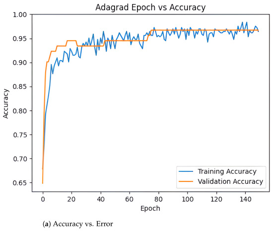 Following this, the algorithm computes the gradient of the error function L with respect to the network’s weights, employing the chain rule to facilitate the backpropagation of this error gradient through the layers. The chain rule allows for the systematic calculation of the derivative of the error function concerning each weight, effectively determining how much each weight contributed to the overall error [39,40].