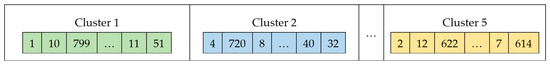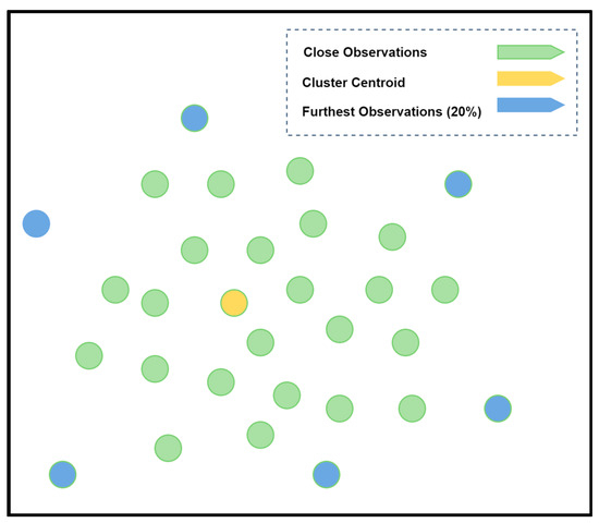 Step 1: 5% of the observations are randomly chosen from each cluster and entered into a list of lists to be considered at the end of this step. Suppose that the 799 observations are distributed in 5 clusters, and each cluster is assigned the following numbers of observations [180, 159, 175, 160, 125]. Considering the above, a list with five temporary lists is defined with the following number of observations [9, 8, 9, 8, 7], which are randomly chosen from each cluster.