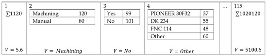 The representation of a centroid is a vector of 115 variables, the same as the mineable view. For the numeric data type columns, an average of the values the instances have is stored; for the nominal and binary ones, the observed frequency of each instance’s values is stored. Figure 4 represents an example of a centroid. Figure 4 shows a centroid that belongs to a cluster that has 200 instances; positions 1 and 115 belong to numerical features (continuous) and contain the sum of the values that the 200 instances have in those features, positions 2, 3, and 4 are binary and nominal variables and therefore have the observed frequency of the values that the 200 instances have; this means that for position 2, 120 observations have the machined value and 80 the manual value. With this representation, when an observation is added or removed in a cluster, it is faster to update the control structures of the 115 centroid variables. The mean is taken for the numerical variables to determine the value that the centroid uses as a representative for each of the 115 variables, and the mode is used for the binary or nominal variables. For the example in Figure 4, the value taken by the centroid at position 2 is mechanized because it corresponds to the mode in that feature, and for position 115, the value to take is 5100.6 (=1,020,120/200) because it is the mean of the 200 instances that belong to the cluster.