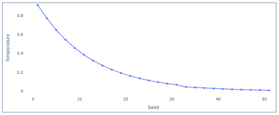 Equation (2) generates a geometric decrease in temperature, and its behavior is shown in Figure 5. It should be noted that temperature plays an essential role in the metaheuristics of Simulated Annealing as a strategy to get out of local optima because when the temperature takes values close to the maximum temperature (max_t), there is a greater probability of accepting solutions that are not efficient, that is, performing exploration, but when this probability decreases and tends to the minimum value (min_t), exploitation is carried out and only solutions better than the current solution are accepted.