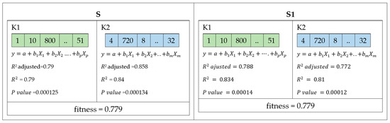 The new list of clusters is used to construct a new solution of the CLR approach; this new solution to be accepted must satisfy the feasibility criteria to make the new solutions s1 generated from s valid solutions (feasible) even if they are not better. The comparison of the new solution s1 with the current solution s, to determine if it is better, is conducted considering the models of each solution; this means that apart from the fitness of the solution, the lower R2 adjusted of each solution is compared, and with this, it is ensured that the models of each solution have less variance. This comparison process is explained below with an example.