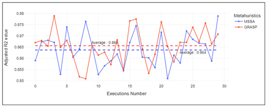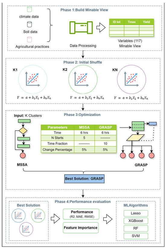After the initial shuffling, the MSSA or GRASP metaheuristic was used to optimize the search space over a determined period, taking the distribution obtained in the initial shuffling as a starting point. The search process was supported by multiple linear regression, which generated regression models for each cluster of instances, taking crop yield as the dependent variable. The models generated for each cluster have an associated R2 adjusted; then, the mean (average) of the R2 adjusted obtained in the K models is calculated, and the value obtained is taken as a measure of the quality (fitness) of the solution.