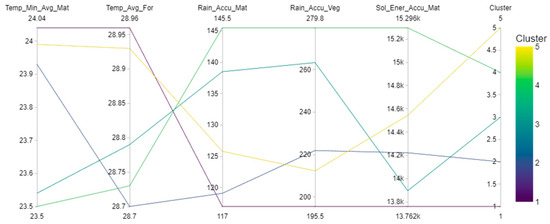 Finally, from the process of searching for an optimal solution, the best CLR model is obtained, consisting of a set of K linear regression models and their corresponding K centroids; this solution is shown in Figure 3; these models are associated with each one of the clusters found in the best solution. These multiple linear regression models describe and identify features that have a level of importance and impact on their respective cluster of instances (crops) under the R2 adjusted criterion associated with each model.