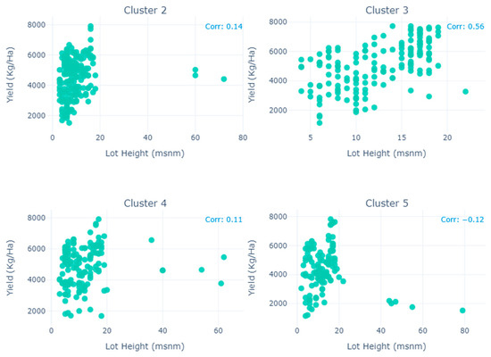 Correlation between lot height vs. yield maize. Cluster 2, Cluster 3, Cluster 4 and Cluster 5.
