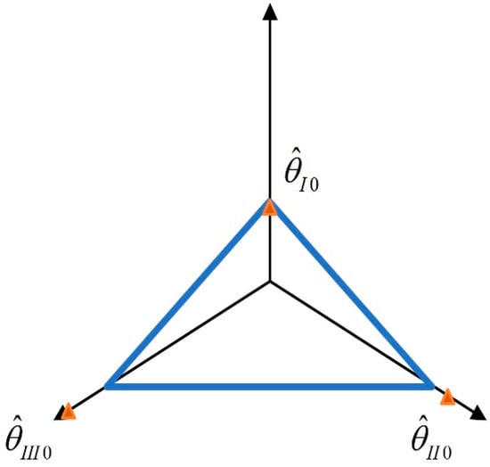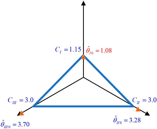 As previously mentioned, this study assesses the performance of food processing machines in terms of processing, repair reporting, and maintenance using a 120-degree equiangular three-axis radar chart. Firstly, three critical values () are plotted on the three radar axes, and these critical values are connected to form a triangle, which this paper refers to as an evaluation block. Next, the observed values () of the estimators for the three performance indices mentioned above are plotted on the three radar axes, as shown in Figure 1.