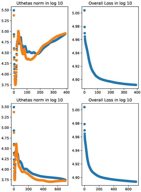 norm of the score functions and (Uthetas norm) in blue and orange colors, respectively, and overall loss of the ZIG model in log10 scale. Top two panels: without learning rate adjustment; bottom two panels: with learning rate adjustment. All parameters were initialized with true parameter values except for . In the top panels, the norms of the score vectors decrease drastically in early iterations but increase over later iterations even though the overall loss is consistently reduced. In the bottom panels, the norms of the score vectors first show similar pattern as the top panel but consistently decrease in later iterations. The overall loss shows the desired reducing trend throughout all iterations.