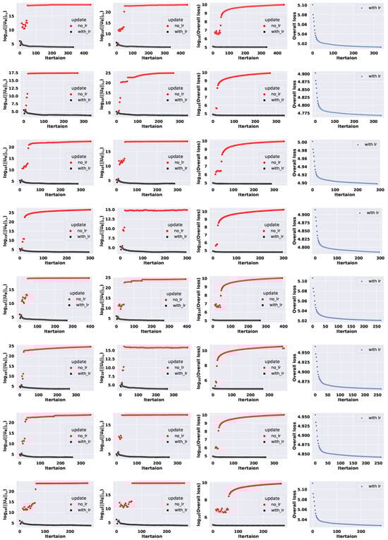 Comparing performance of the alternating ZIG regression using log link with or without learning rate adjustment over 8 simulated datasets. Each row is for one dataset. First column: norm of ; second column: norm of ; third column: (overall loss); fourth column: overall loss of the algorithm with learning rate adjustment.