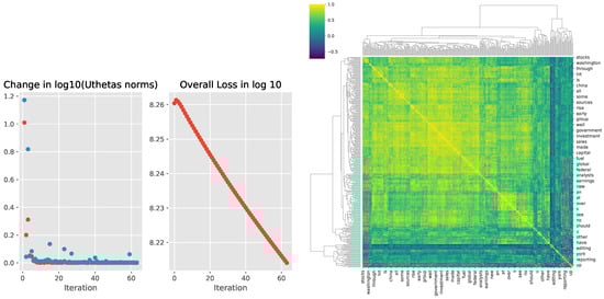 (Left): The absolute value of change in the log10 norms of (red) and (blue) from successive iterations and overall loss curve. (Right): Cosine similarity of word vector representations shown as heatmap.