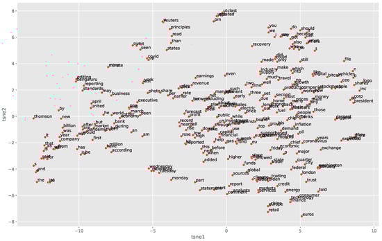 To visualize the relationships between different words, we first project the learned vector representations to the first 10 principal components (PCs). These 10 PCs cumulatively explained 97% of variations in the word vectors. We then conduct further dimension reduction with T-Distributed Stochastic Neighbor Embedding (t-SNE) to two-dimensional space. The t-SNE minimizes the divergence between two distributions: a distribution that measures pairwise similarities of the input objects and a distribution that measures pairwise similarities of the corresponding low-dimensional points in the embedding. The words on t-SNE coordinates are shown in Figure 5. Each point on the plot represents a word in the low-dimensional space. The closer two words are on the plot, the more similar they are in meaning or usage. For example, the top five most similar words to ‘capital’ from the 300 words are ‘firm’, ‘management’, ‘fund’, ‘board’, ‘financial’. These are based on the cosine similarity. The five most similar words to ‘stocks’ from the 300 words are ‘companies’, ‘bitcoin’, ‘banks’, ‘prices’ and ‘some’. The top five most similar words to ‘finance’ are ‘technology’, ‘energy’, ‘trading’, ‘consumer’, ‘analysts’. Words ‘monday’, ‘tuesday’, ‘wednesday’ are clustered together. This scatter plot captures some semantic similarities.