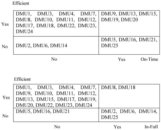 - The fourth group encompasses DMU units that achieve on-time or in-full deliveries and efficiently utilize resources. These units serve as benchmarks for the previously mentioned groups since they surpass the set threshold for OT or IF.
